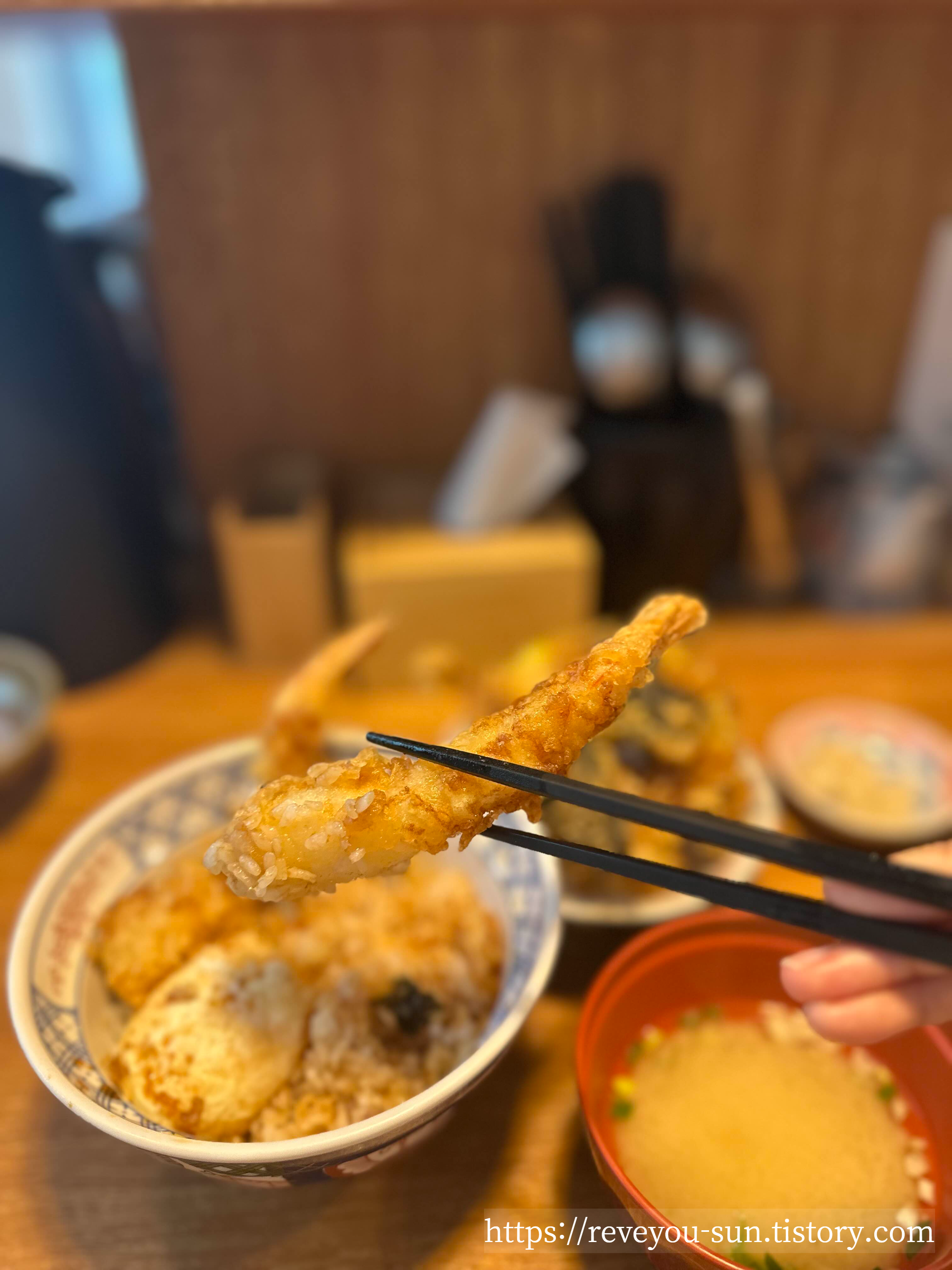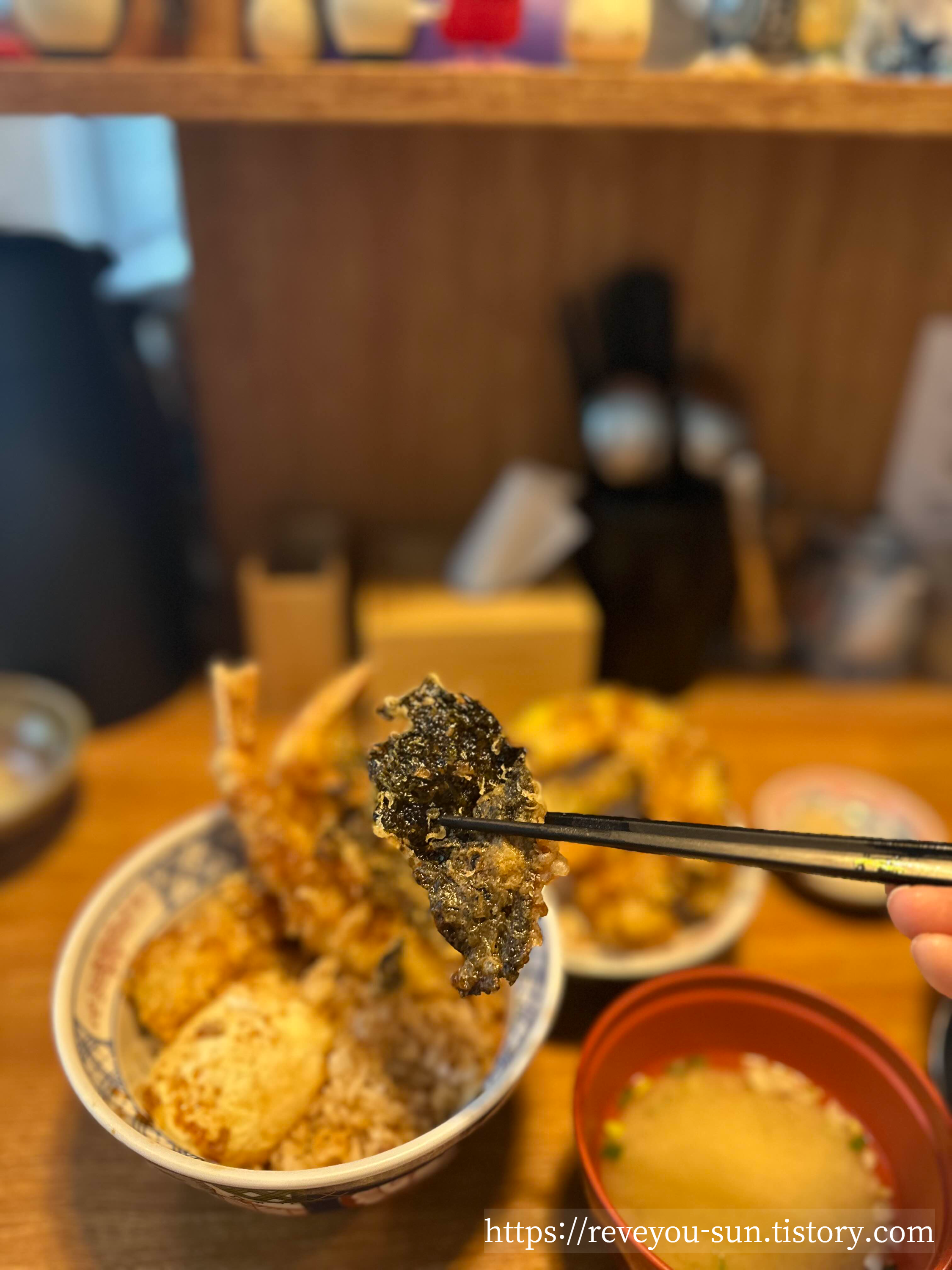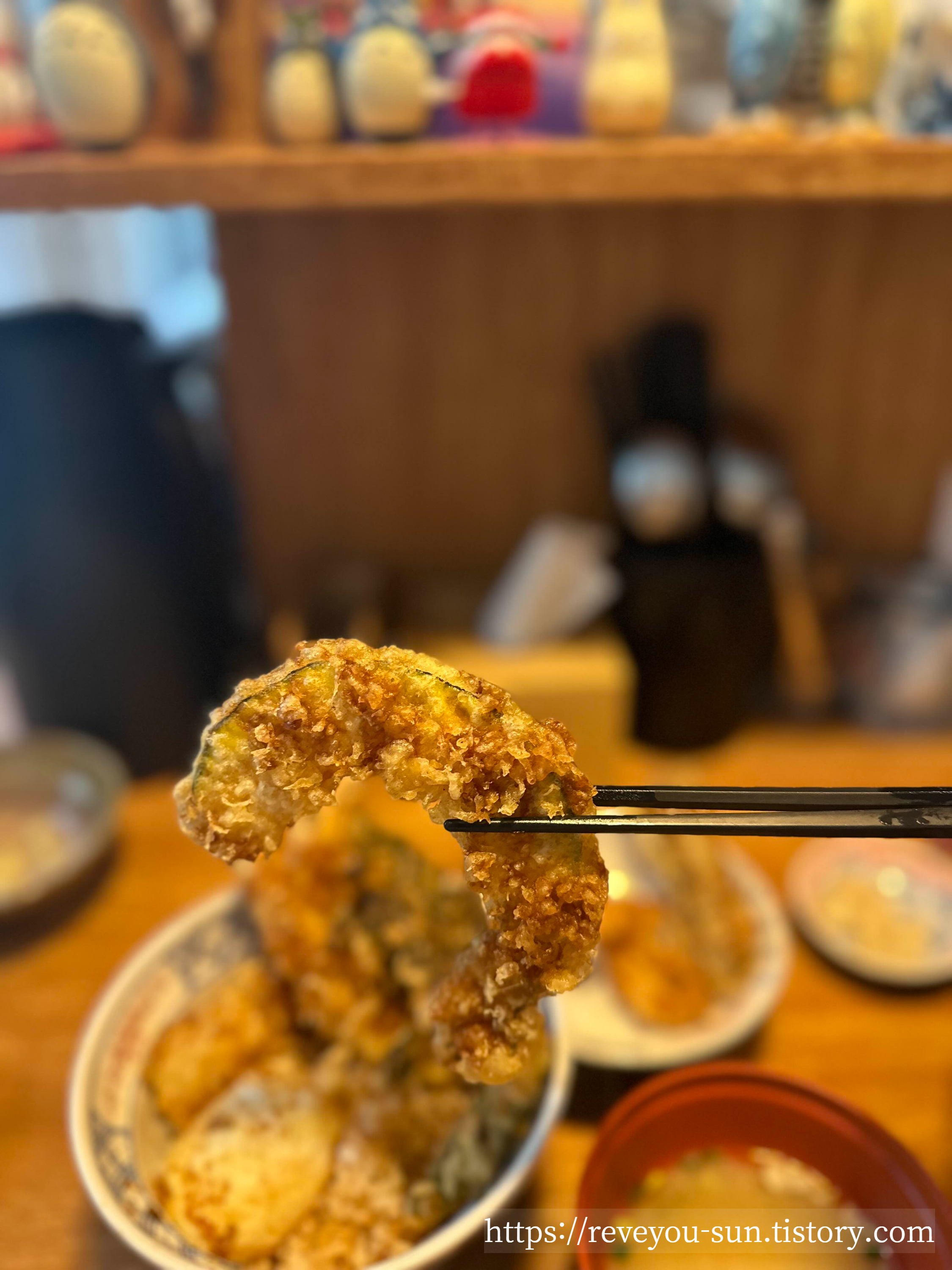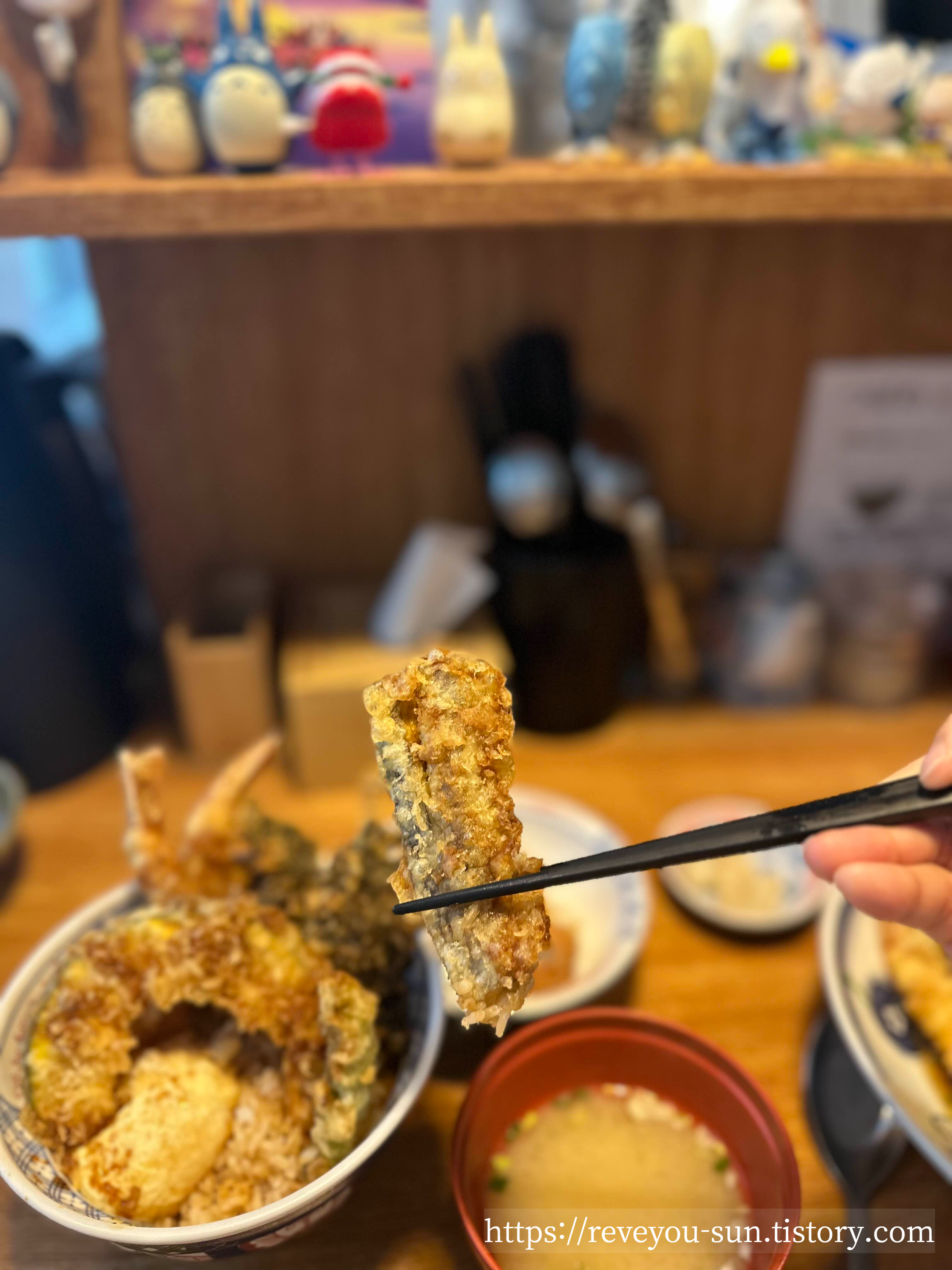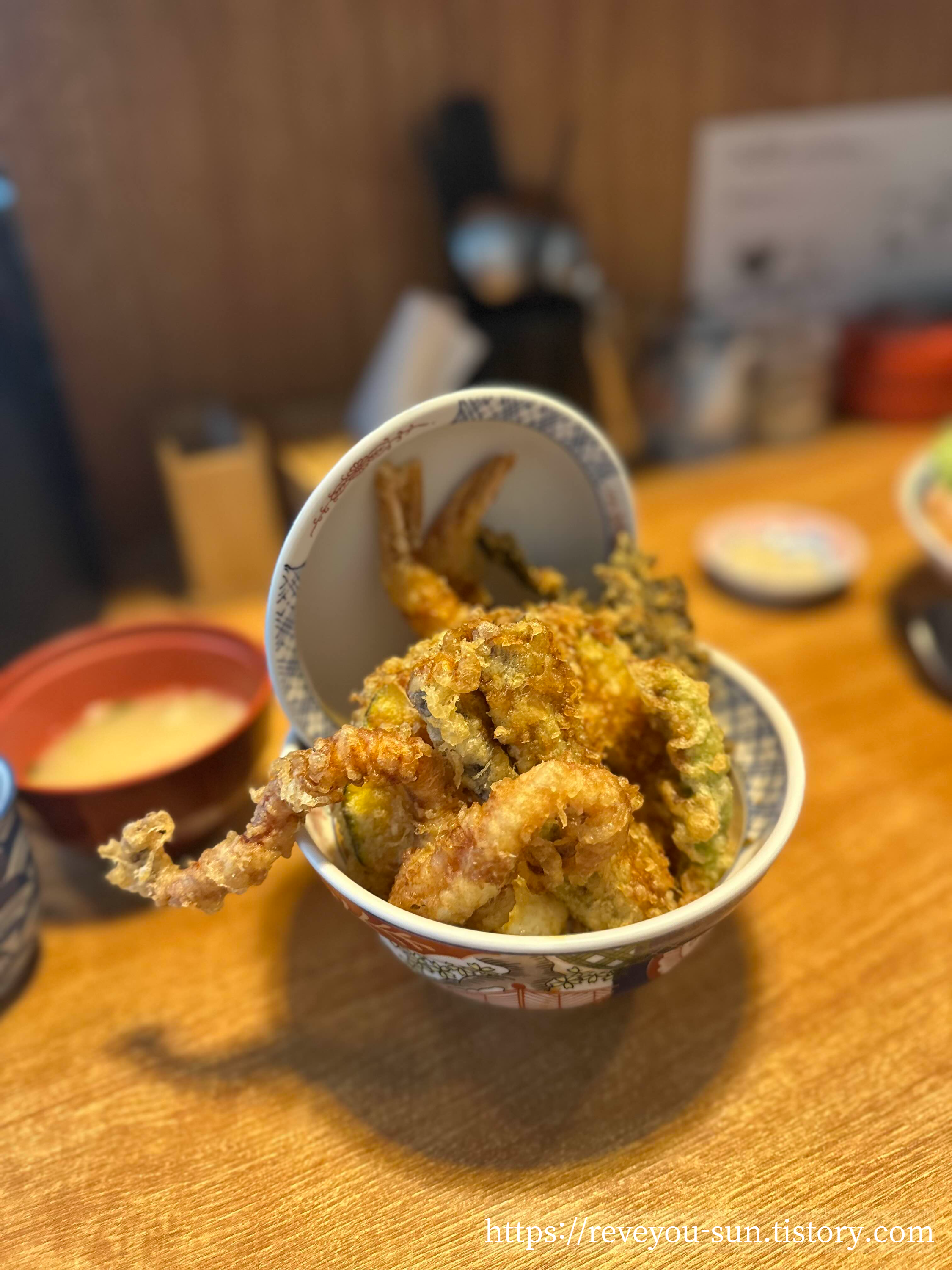 텐동이 제공되었을 때, 가장 먼저 눈에 띈 것은 튀김의 양이었다. 접시 위에는 새우, 고구마, 가지 등의 튀김이 가지런히 놓여 있었으며, 적절한 두께의 튀김옷이 고르게 입혀져 있었다. 튀김을 한입 먹어보니 바삭한 식감이 강조되었으며, 속 재료는 촉촉함을 유지하고 있었다.